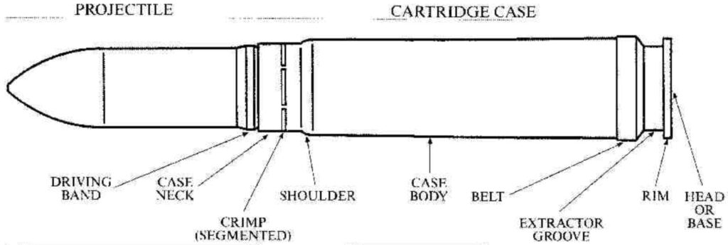 The two key dimensions of a cartridge are the calibre and length of the case. The calibre is the approximate diameter of the projectile, or the inside diameter of the empty case. The length is the length of the case only, not including the projectile. These dimensions are expressed in millimetres, so for example a 12.7 x 99 cartridge has a case with a calibre of 12.7mm and a length of 99mm (this is, in fact, the dimensions of the 0.50 inch Browning cartridge). Where more than one number is given for the case length, it could be found with different lengths. The third identifier is the type of rim. Most military cases of less than 40mm calibre are rimless, that is the rim is the same size as the case body and separated from it by an extractor groove. Most larger cases are rimmed; the rim is larger than the body and forms a flange at the base. These are identified by the letter R after the metric measurements. Other rim types are: semi-rimmed or semi-rimless (SR) with both a small extractor groove and a rim slightly larger than the body; belted (B) which is like the rimless type except there is a raised belt just above the extractor groove (see photo above); and rebated (RB, or RR) in which the rim has a smaller diameter than the body. Examples of these case types can be seen below. A drawing of the main elements of a typical cannon cartridge is shown below.